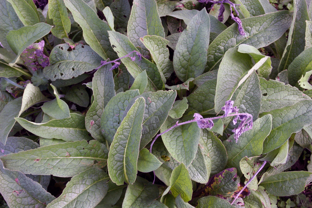 Cultivated for over 2,400 years, Comfrey is renowned for its healing properties. Various alternative names reflect the history of this usage in folk medicine, and include "Knitbone", "Bruisewort", and "Boneset". Greeks and Romans used comfrey to stop bleeding, treat bronchial infections, and heal wounds and broken bones. Poultices were made for external wounds and tea was consumed for internal ailments.