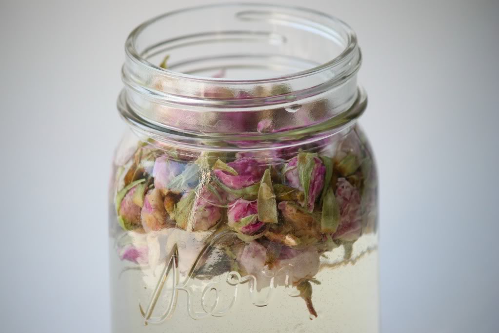 - Place dried roses in a heatproof jar and pour hot water over the top.