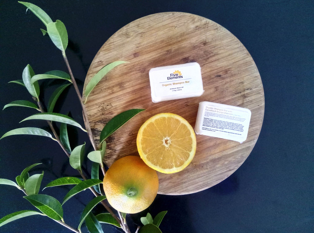 Five Elements Organic Solid Shampoo Bar contains all natural ingredients, and features Camellia oil and Neroli (Orange Blossom) oil, which help nourish and protect your hair and scalp.